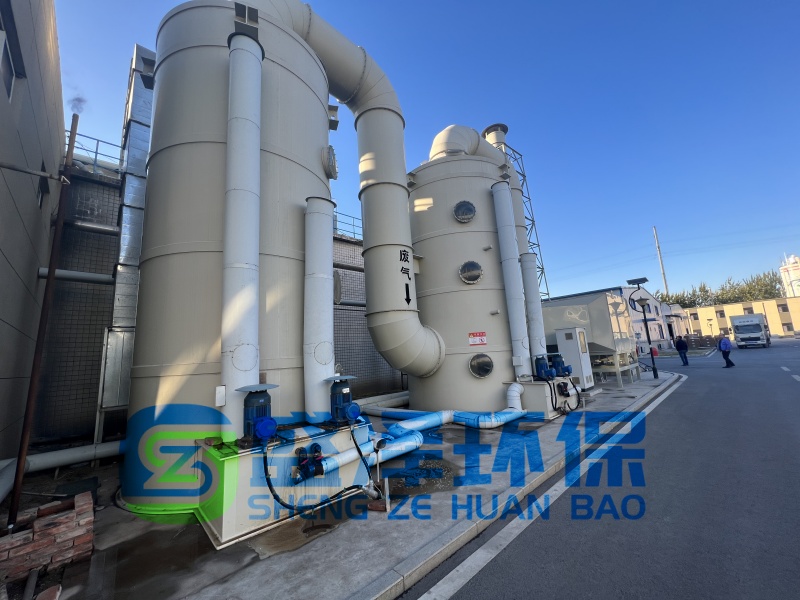 廢氣進入第一級噴淋塔,與向下噴灑的化學(xué)吸收液(如稀硫酸、次氯酸鈉或?qū)S贸魟┠媪鹘佑|。